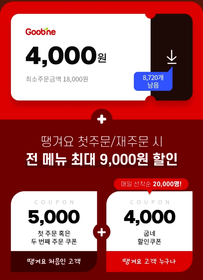 특히 땡겨요를 아직 사용해 보지 않으신 분들은 첫번째와 두번째까지 각각 5천원의 쿠폰을 제공 받게 되는데, 이것과 함게 매일 제공하고있는 굽네치킨의 쿠폰을 중복으로 사용하게 된다면 9천원이 할인 들어가는 것을 직접 눈으로 확인하실 수 있을 것입니다.
