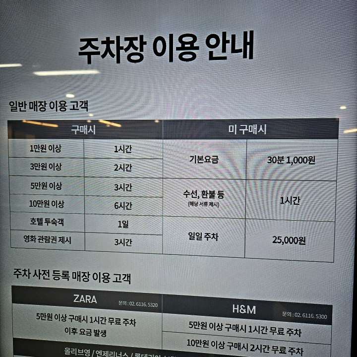 단 매장별로 차이가 있는 곳이 있는데 자라나 h&m같은 경우에는 5만 원을 기준으로 1시간 무료 주차를 해 주며, h&m은 10만 원 이상 산다면 2시간을 주지만 자라는 5만 원까지만 그 이후에는 추가 요금이 발생하는 것을 확인할 수 있습니다.