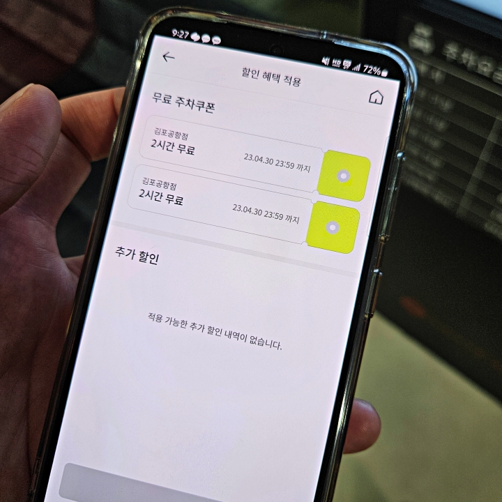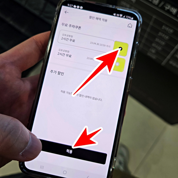 보시는 화면처럼 두 장에 2시간 쿠폰이 나에게 주어져 있을 것입니다. 이 중에 하나를 선택해서 적용하면 2시간까지는 주차비를 할인받을 수 있습니다.