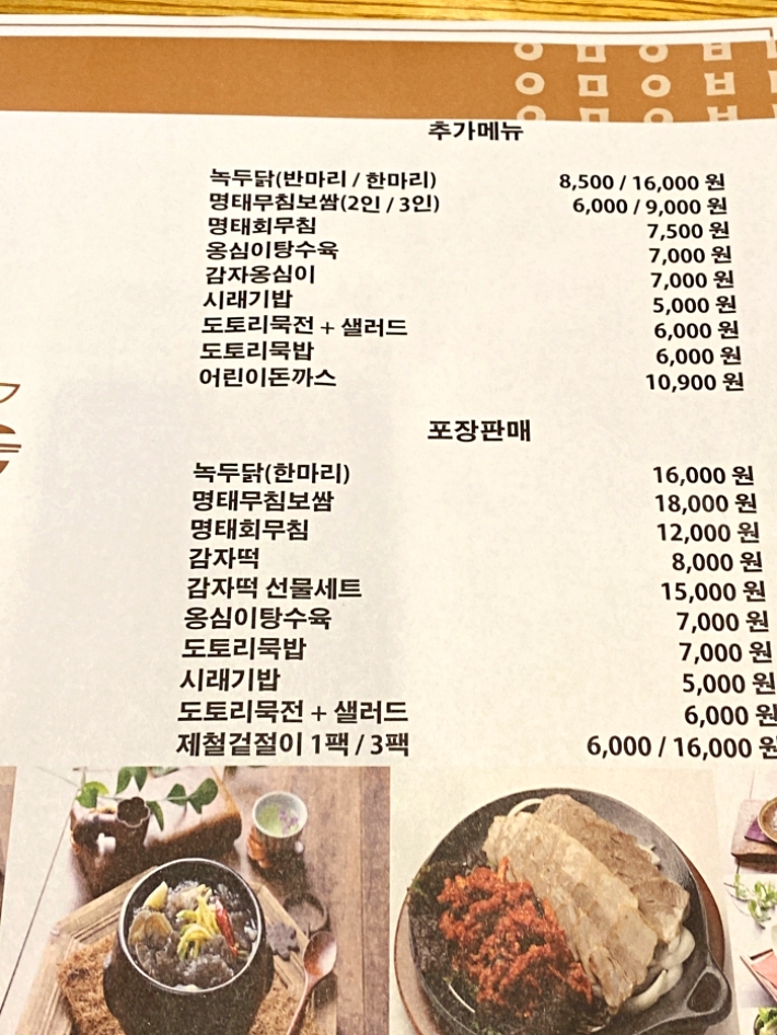 이곳은 정식 메뉴가 나오는데 두 가지로 갈리며 각각 메뉴 중에 있어서 명태 무침 보쌈만 차이가 나기 때문에 취향에 따라 선택하여 드시면 되실 것입니다.