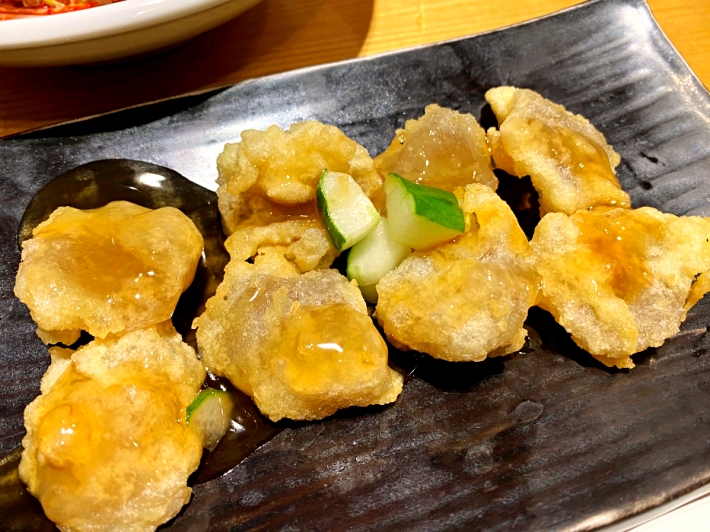김치는 제가 생각한 매운, 겨울에 담궈 먹는 맛은 아니었지만 간이 입에 맞았습니다. 오른쪽으로 보이는 것은 감자 찹쌀떡이었는데 안에 쫀쫀하게 감자 옹심이가 들어있어 진짜 탕수육보다 맛이 있는 것 같았습니다. 거기에 새콤달콤한 소스까지 더해져 정말 건강하고도 속 편한 식사였습니다.