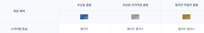 각각 등급을 살펴보면 모닝캄 클럽, 모닝캄 프리미엄 클럽, 밀리언 마일러 클럽으로 그 본대는 것을 확인할 수 있습니다. 한눈에 보기에도 밀리언 마일러 클럽이 가장 많은 혜택을 받을 수 있을 것 같이 생겼는데 과연 각각 어떤 차이점을 지니고 있는지 비교해 보도록 하겠습니다.