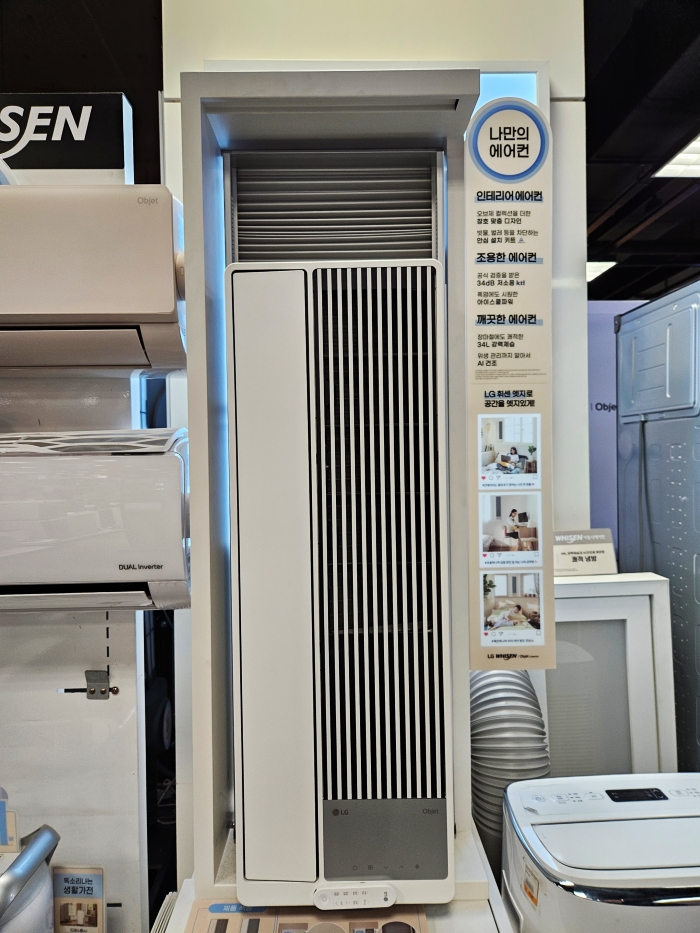 아마도 거실에 놓는다면 스탠드 형식을 알아보시겠지만 벽걸이를 살펴보시는 것을 보면 공간이 넓지 않은 안방이나 자녀방 등에 설치할 예정이실 것입니다.