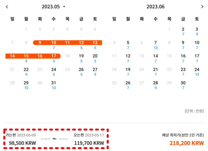 찾아보는 과정 중에 있어서 파란색 숫자로 비용이 언제가 저렴한지 대략적으로 한눈에 살펴볼 수 있기 때문에 비용에 맞춰서 일정을 계획하고 계시는 분들도 이 방법을 통해서 알아보시면 도움이 되실 겁니다.
