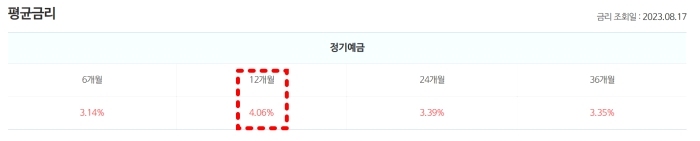 위의 표를 살펴보면 저축은행의 정기예금의 경우에는 일 년을 기준으로 했을 때 4.06%의 이자를 수령할 수 있다고 확인되었습니다.