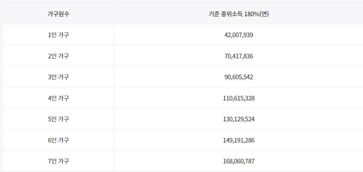 세번째는 가구원 기준 중위소득이 180% 이하여야 합니다.