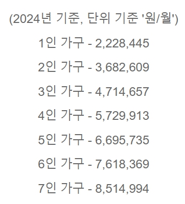 따라서 1인 가구 기준 월 2,28,445원이 넘어서는 안됩니다.