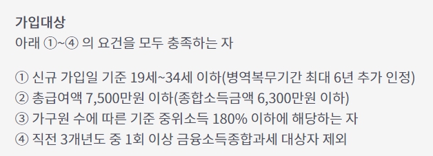첫번째로는 나이 제한이 있습니다. 청년층으로 19세부터 34세 내의 대한민국 국민이어야 합니다. 이때 남성분들은 군대를 가시기 때문에, 병역 복무기간을 최대 6개월까지는 인정해 주고 있어, 군필자분들은 40세까지도 가능합니다.
